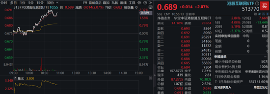 热门ETF方面,重仓港股互联网龙头的港股互联网ETF(513770)早盘高开后横盘震荡,随后45度拉升走强,场内价格现涨2.07%,实时成交额超1亿元。