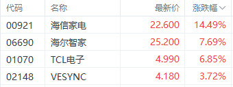 家电股中,海信家电(00921.HK)、(06690.HK)、(01071.HK)分别上涨14.49%、7.69%、6.85%。