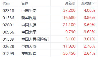 保险股中,中国平安(02318.HK)、(01336.HK)、(02601.HK)分别上涨4.06%、3.86%、3.68%。