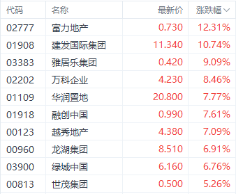 房地产股中,富力地产(02777.HK)、(03383.HK)、(02202.HK)分别上涨12.31%、9.09%、8.46%。
