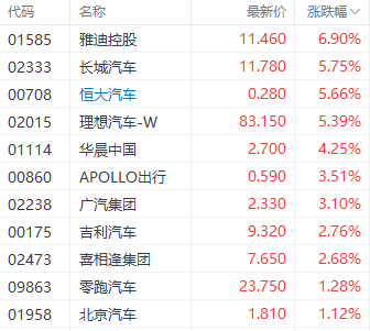 汽车股中,(02333.HK)、(02015.HK)、(00175.HK)分别上涨5.75%、5.39%、2.76%。