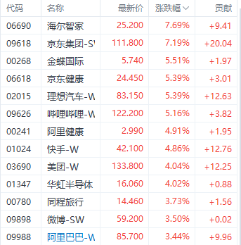 从上图来看出,科技指数涨幅居前,且(09618.HK)、(09626.HK)、(01024.HK)等指数成份股均超4%。