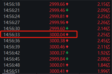 沪指突破半年线和年线,于14:56:33直接站上3000点。