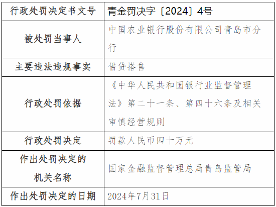 正文 农行青岛市分行被罚40万元:因借贷搭售 辉煌优配 V管理员 /2024-08-16 17:09:21/49阅读/0评论 0816 此篇文章发布距今已超过436天,您需要注意文章的内容或图片是否可用! 8月16日金融一线消息,国家金融监督管理总局青岛监管局行政处罚信息公开表显示,中国股份有限公司青岛市分行因借贷搭售,被国家金融监督管理总局青岛监管局罚款人民币四十万元。