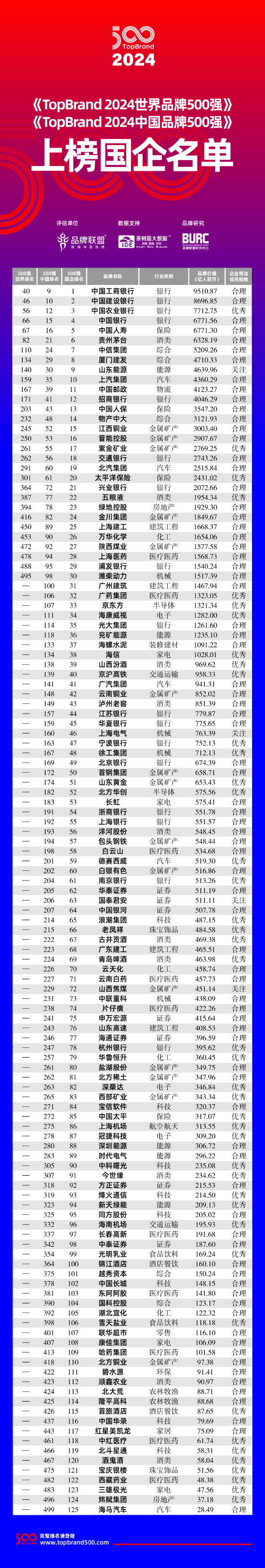 据悉,在本届品牌节上还第三次发布了《TopBrand世界品牌500强》榜单。共有38家央企成为2024年度的全球品牌500强。其中,中国石化作为品牌价值最高的中国企业,在该榜单中排名第12;共9家央企进入全球品牌前100强,比上年略有缩减。