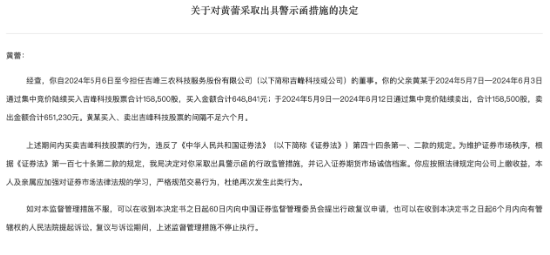 据四川证监局公告显示,黄蕾自2024年5月6日起担任吉峰科技的董事。然而,在任职期间,黄蕾的父亲黄某在2024年5月7日至6月3日期间,通过集中竞价方式陆续买入了吉峰科技的股票共计158,500股,涉及金额648,841元。随后,在不足六个月的间隔期内,黄某又于2024年5月9日至6月12日通过集中竞价方式将上述股票全部卖出,卖出金额总计651,230元。这一行为明显违反了《中华人民共和国证券法》中关于短线交易的规定。