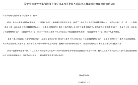 8月21日,湖南证监局发布了对长沙沙电电气股份有限公司(以下简称“长沙沙电”)及其时任董事长喻新飞、董事会秘书童淳的行政监管决定,因公司未按规定披露2023年年度报告,违反了相关信息披露法规,决定对公司及上述责任人采取出具警示函的监管措施。