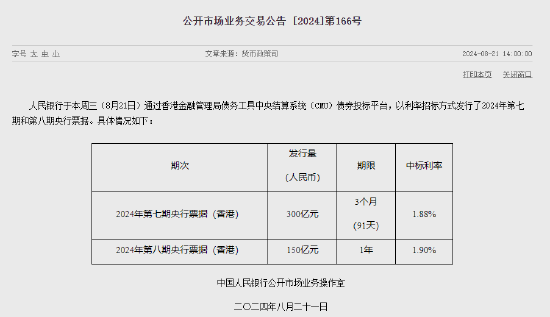 正文 央行发行2024年第七期和第八期央行票据 辉煌优配 V管理员 /2024-08-21 14:48:02/40阅读/0评论 0821 此篇文章发布距今已超过413天,您需要注意文章的内容或图片是否可用! 8月21日金融一线消息,中国人民银行发布公告,人民银行于本周三(8月21日)通过香港金融管理局债务工具中央结算系统(CMU)债券投标平台,以利率招标方式发行了2024年第七期和第八期央行票据。