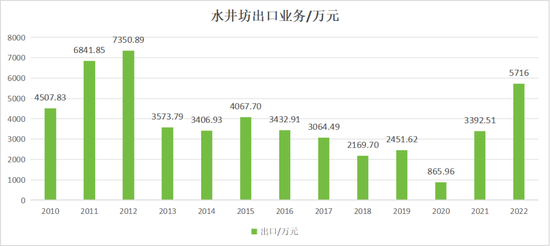 到了2022年,该公司出口收入为5716万元,仅占其总营收的1.23%,还比不上2012年。也就是说,十年时间,水井坊的国际化之路不进反退。相比之下,2022年茅台海外收入已达到42.4亿元。