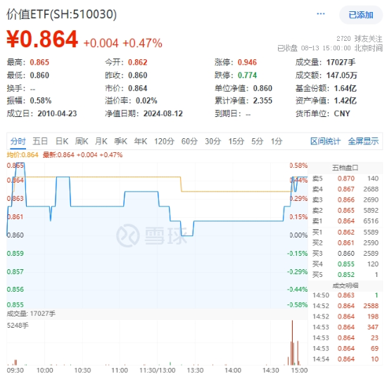 今日高股息表现亮眼,聚焦“高股息+低估值”大盘蓝筹股的价值ETF(510030)场内价格最高涨0.58%,而后几乎全天红盘震荡,截至收盘,涨0.47%,涨幅跑赢沪指(0.34%)。