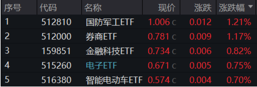 盘面其他方面,国防军工延续近期活跃表现,今日再次领涨两市,中船系领衔涨势,商业航天、低空经济等热门题材普遍回暖,国防军工ETF(512810)场内价格收涨1.21%。