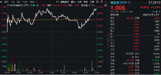 表征国防军工板块行情走势的国防军工ETF(512810)早盘震荡走高,午后涨幅逐渐回落,尾盘突然发力拉升,场内价格收涨1.21%,全天成交额达4358万元,较昨日略有放量。