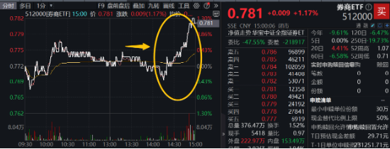 A股顶流券商ETF(512000)尾盘直线拉升,场内价格收涨1.17%,伴随成交放量,全天成交额近3亿元。