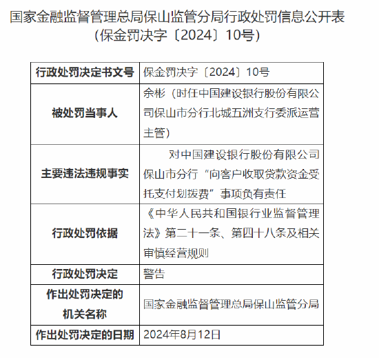 正文 中国建设银行保山市分行被罚70万元:因向客户收取贷款资金受托支付划拨费等违法违规行为 辉煌优配 V管理员 /2024-08-28 19:58:03/40阅读/0评论 0828 此篇文章发布距今已超过413天,您需要注意文章的内容或图片是否可用! 8月28日金融一线消息,国家金融监督管理总局保山监管分局行政处罚信息公开表显示,中国股份有限公司保山市分行因个人贷款支付管理与控制不到位,部分信贷资金违规流入限制性领域;向客户收取贷款资金受托支付划拨费,被罚款70万元。 余彬(时任中国建设银行股份有限公司保山市分行北城五洲支行委派运营主管)对中国建设银行股份有限公司保山市分行“向客户收取贷款资金受托支付划拨费”事项负有责任,被警告。